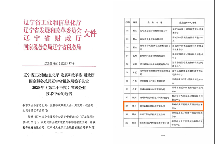 2020年8月28日,經(jīng)遼寧省工業(yè)和信息化廳、發(fā)展和改革委、財(cái)政廳、國家稅務(wù)總局遼寧省稅務(wù)局的聯(lián)合審定,佑鑫石英研發(fā)部獲批為第二十三批省級(jí)企業(yè)技術(shù)中心。